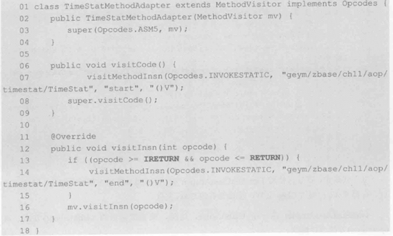 | 第6行的visitCode()在方法Code属性被访问时调用,因此,这里插入对TimeStat.start()方法的调用,表示方法的开始。 |
