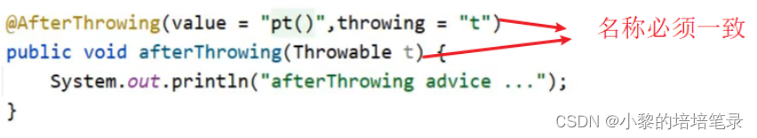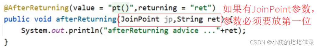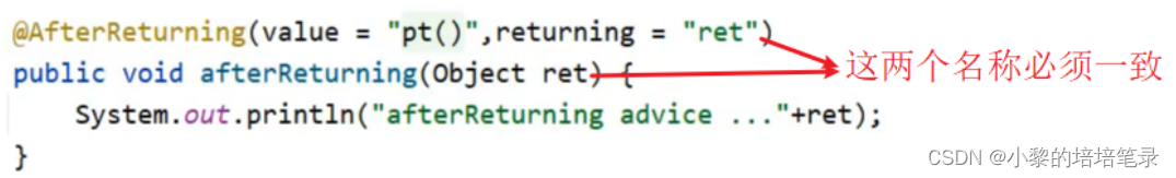 @Component @Aspect public class MyAdvice { @Pointcut("execution(* com.itheima.dao.BookDao.findName(..))") private void pt(){} @AfterReturning(value = "pt()",returning = "ret") public void afterReturning(Object ret) { System.out.println("afterReturning advice ..."+ret); } //其他的略 }注意:
