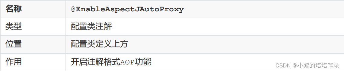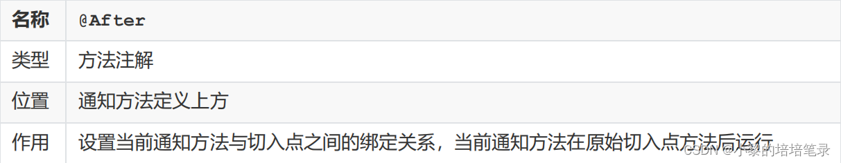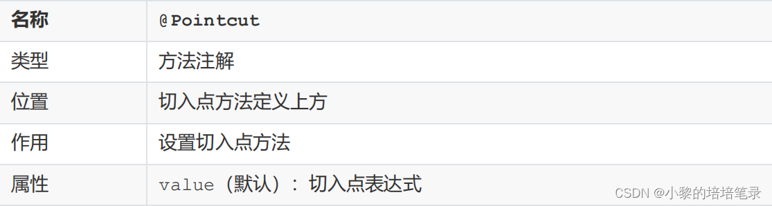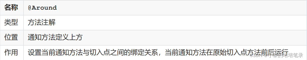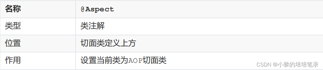 (4) 通知是要增强的内容,会有多个,切入点是需要被增强的方法,也会有多个,那哪个切入点需要添加哪个通知,就需要提前将它们之间的关系描述清楚,那么对于通知和切入点之间的关系描述,我们给起了个名字叫切面