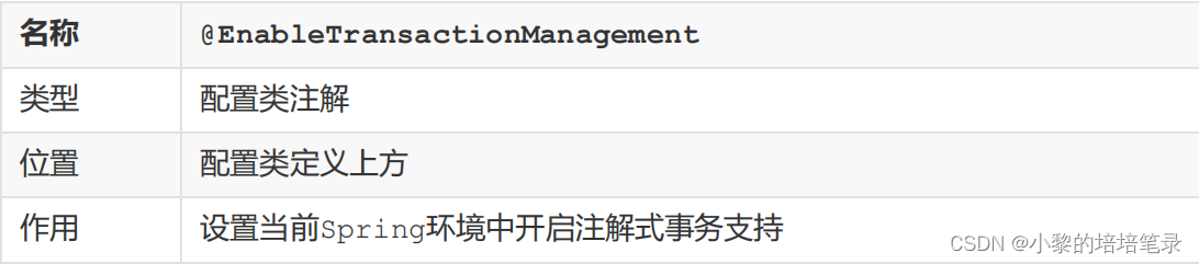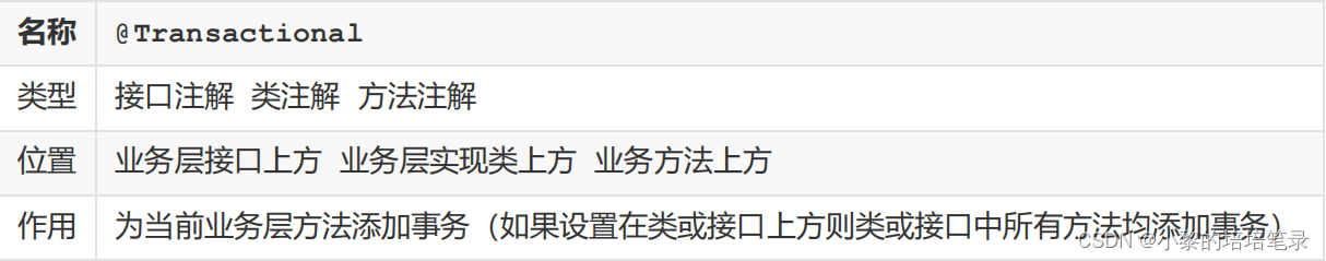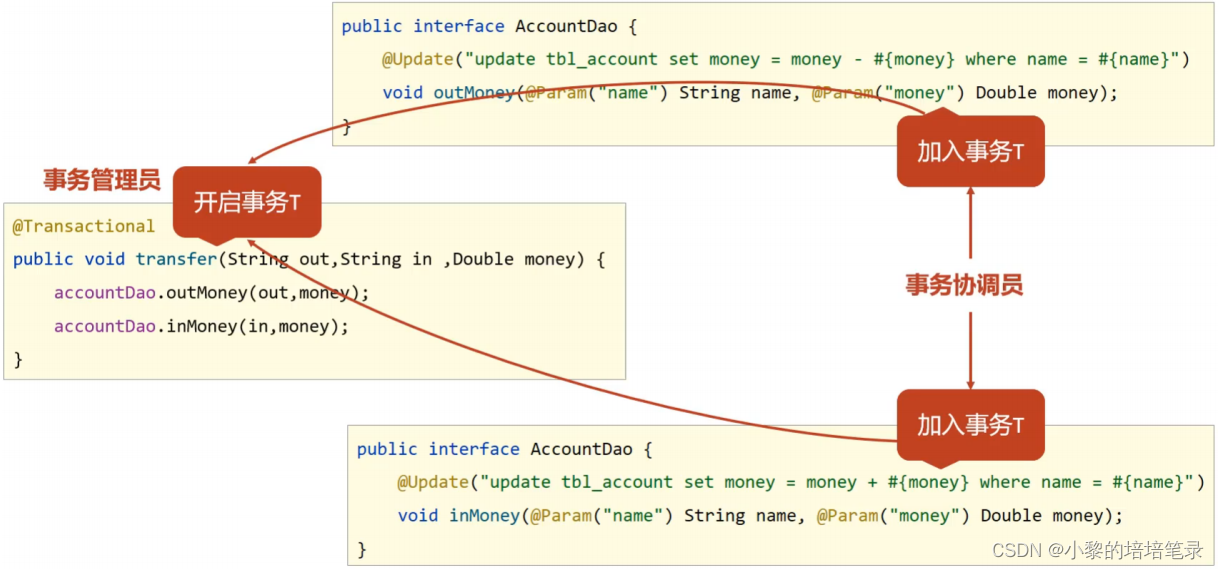 ● 事务协调员:加入事务方,在Spring中通常指代数据层方法,也可以是业务层方法注意 : 目前的事务管理是基于`DataSourceTransactionManager`和`SqlSessionFactoryBean`使用的是同一个数据源。