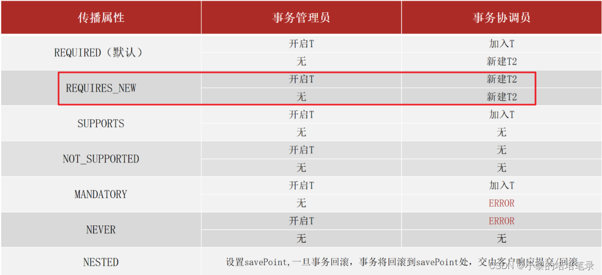 ● 这和我们的需求不符,这个时候我们就想能不能让log方法单独是一个事务呢?要想解决这个问题,就需要用到事务传播行为,所谓的事务传播行为指的是: