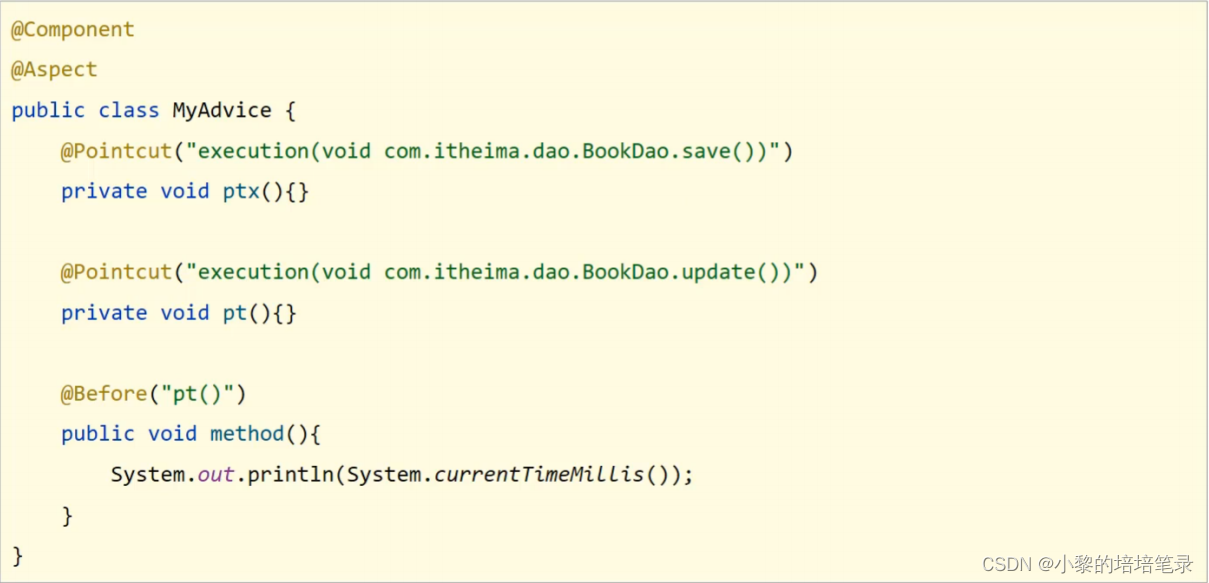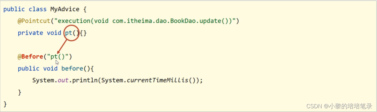 public class MyAdvice { @Pointcut("execution(void com.itheima.dao.BookDao.update())") private void pt(){} public void method(){ System.out.println(System.currentTimeMillis()); } }注意:切入点定义依托一个不具有实际意义的方法进行,即无参数、无返回值、方法体无实际逻辑。