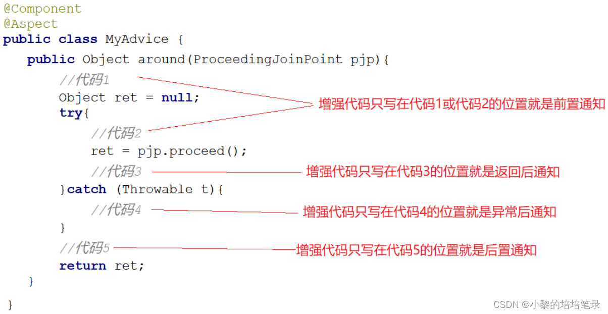环绕通知是如何实现其他通知类型的功能的? 因为环绕通知是可以控制原始方法执行的,所以我们把增强的代码写在调用原始方法的不同位置就可以实现不同的通知类型的功能,如: