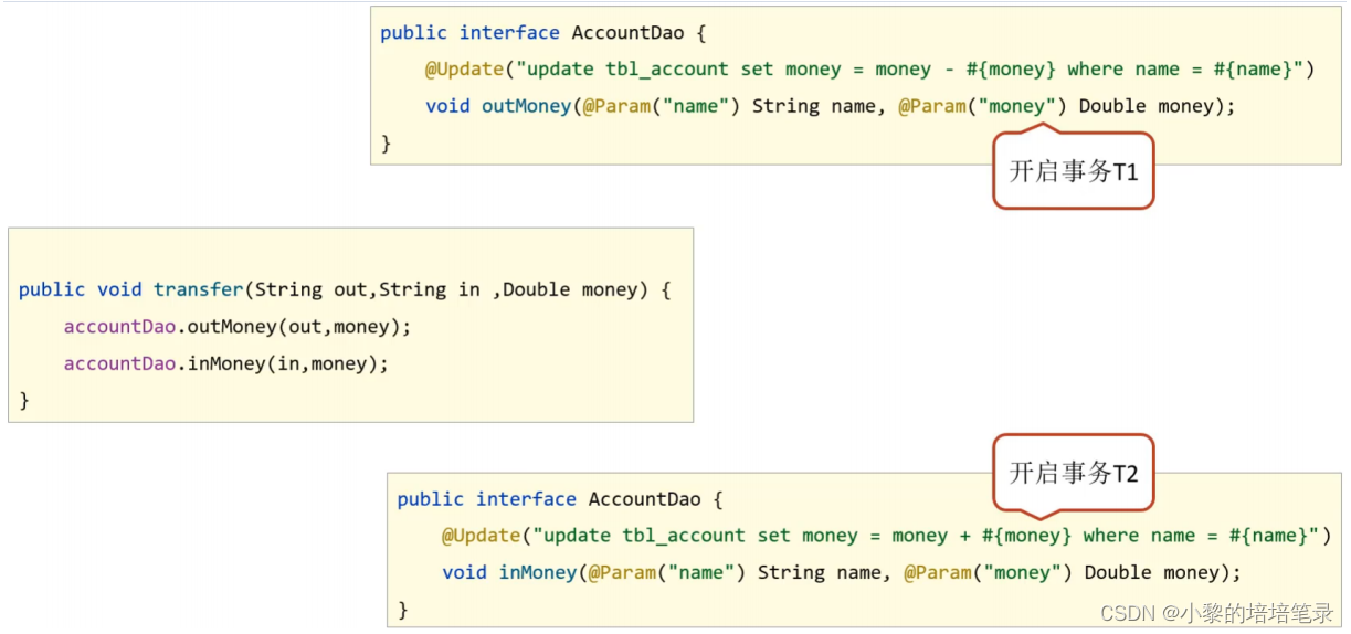 ● AccountDao的outMoney因为是修改操作,会开启一个事务T1