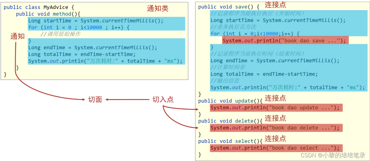 (2) 在四个方法中,`update`和`delete`只有打印没有计算万次执行消耗时间,但是在运行的时候已经有该功能,那也就是说`update`和`delete`方法都已经被增强,所以对于需要增强的方法我们给起了一个名字叫切入点