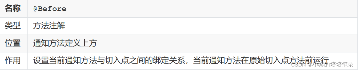 注意: @Before翻译过来是之前,也就是说通知会在切入点方法执行之前执行。