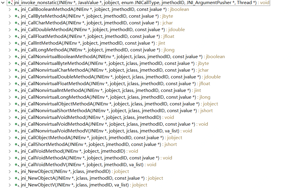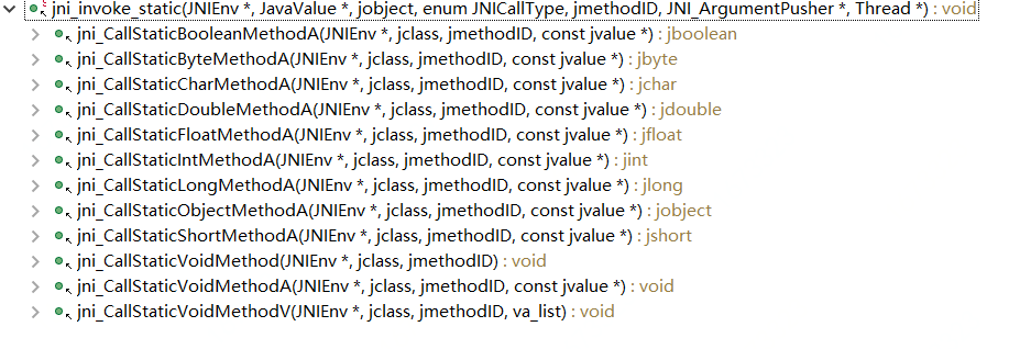 - Call<type>MethodV:按照Java方法中定义的参数类型和顺序将所有参数放入一个va_list类中,该类表示一个参数列表。