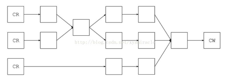 基于事件模型的ASM工具使用生产者-消费者模型转换/产生一个class文件。其转换过程中涉及到自定义的事件生产者,自定义的事件过滤器和自定义的事件消费者这三种组件。其中使用classReader来解析每一个class文件中的事件元素,使用自定义的各种基于方法/变量/声明/类注释的元素适配器来过滤和修改class事件元序列中的相应事件对象,最后使用ClassWriter来重新将更新后的class事件序列转换成class字节码供JVM加载执行。整个生产/转换class文件的过程如下图所示,起点和终点分别是CLASSREADER(CLASS文件解析器)和ClassWriter(class事件序列转换到class字节码),中间的过程由若干个自定义的事件过滤器组成。
