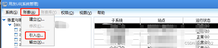 2、打开系统管理,登录后,选择账套,引入账套。