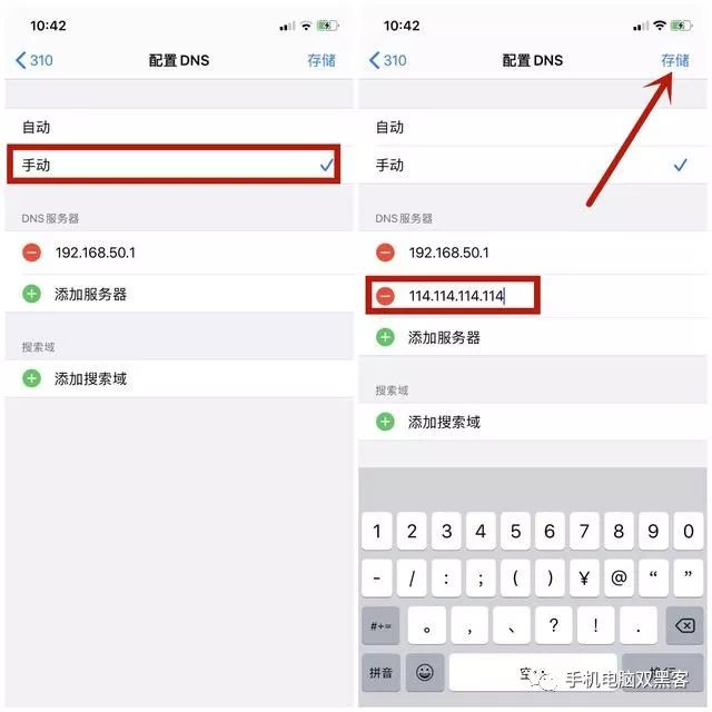 2、之后将配置DNS调整为手动模式,添加新的DNS服务器,输入:114.114.114.114将其保存即可。