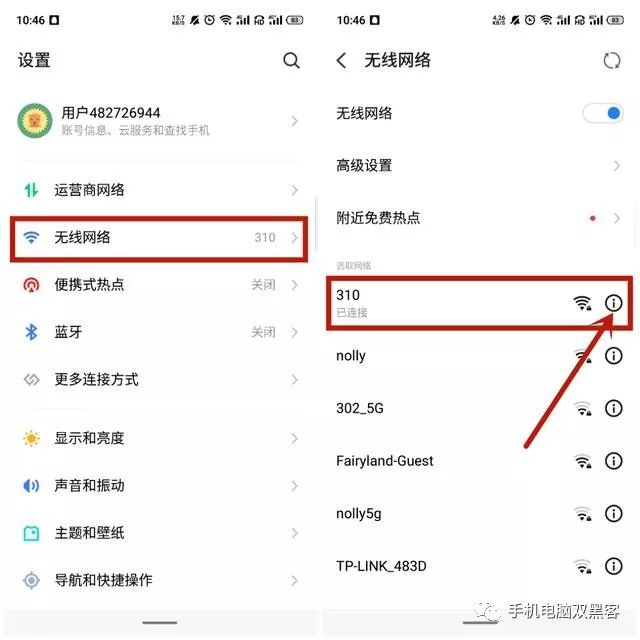 1、首先打开设置找到无线网络,打开无线网络找到自己连接的WiFi,选择后面的感叹号点击。
