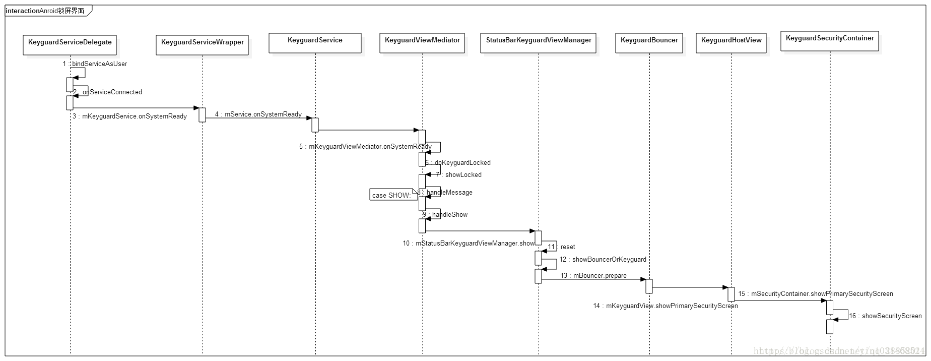 2. KeyguardViewMediator里调用doKeyguardLocked来决定是否需要显示锁屏界面;如果显示则调用StatusBarKeyguardViewManager的show,最后调用到KeyguardHostView的showPrimarySecurityScreen()。
