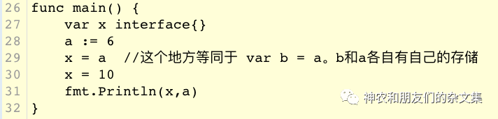 第27行定义了一个x变量,它的类型是interface{}。这个东西类似C++里的void,也有些像Java里的Object。但请注意,它是一个非指针类型。