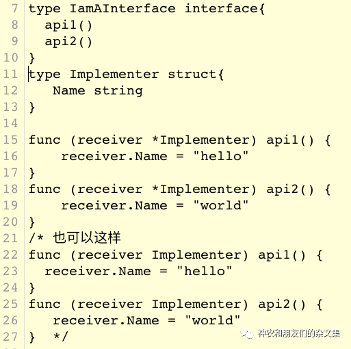 恩,这又是go里实现接口和其它语言不太一样的地方。通过指针定义的receiver,接口函数里是可以改变receiver内部值的。而通过value定义的receiver,接口函数里无法改变receiver内部值——就是传值和传引用的区别,这个不多说了。我们看下一段有意思的地方: