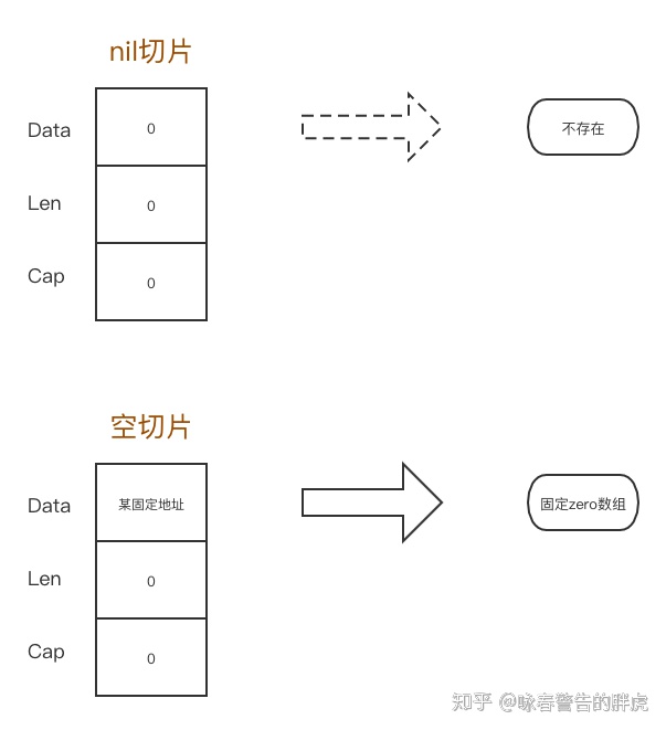 - 空切片的引用数组指针地址是有的,且固定为一个值
