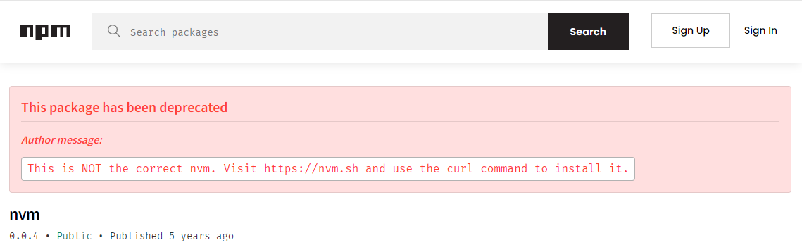 npm官网(nvm - npm)搜索nvm发现,npm已经停用了npm install的方式安装nvm,使用这种方式安装出来的nvm不是一个正确的包。