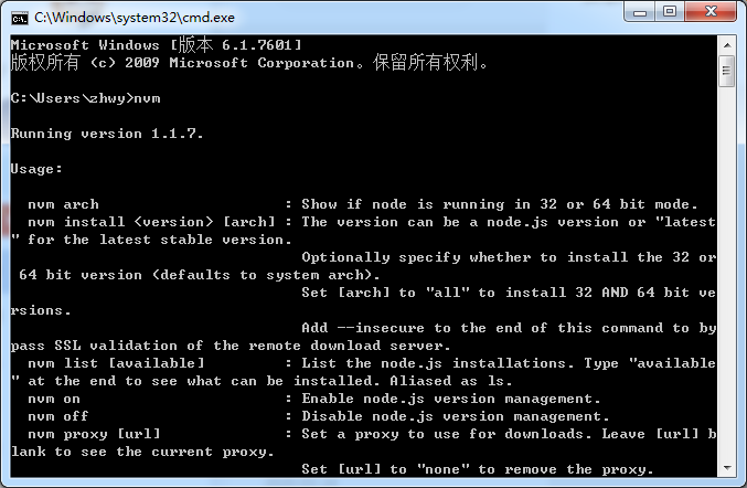 - 检查是否成功:cmd输入nvm,出现nvm版本号和一系列帮助指令,安装成功,失败则会提示nvm: command not found