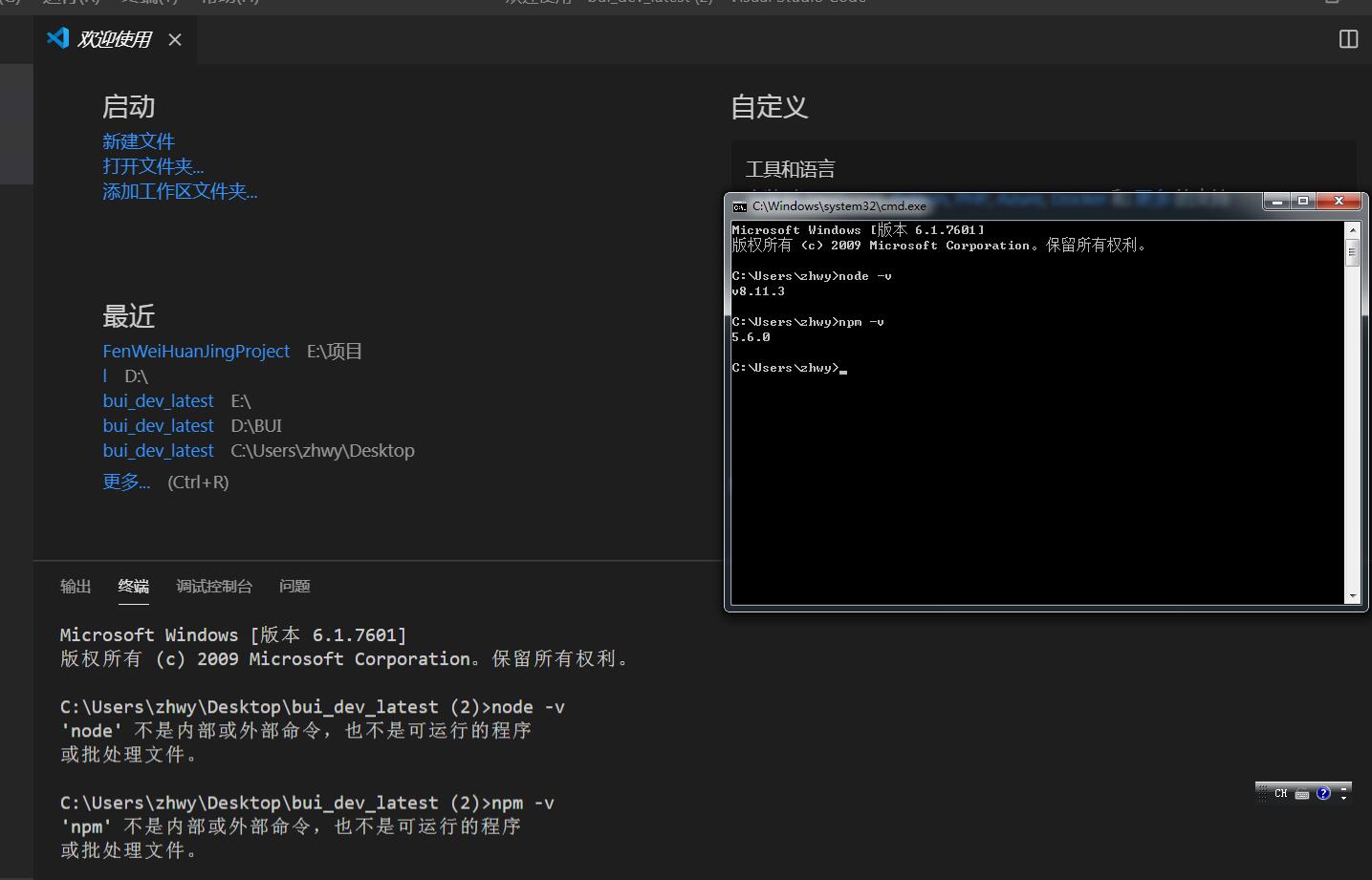 !!!注意:如果重新安装了node,在cmd里node -v可以出现版本号,但是在vscode里的终端上显示”node不是内部命令也不是可运行的程序“这句话(如下图)重启电脑即可