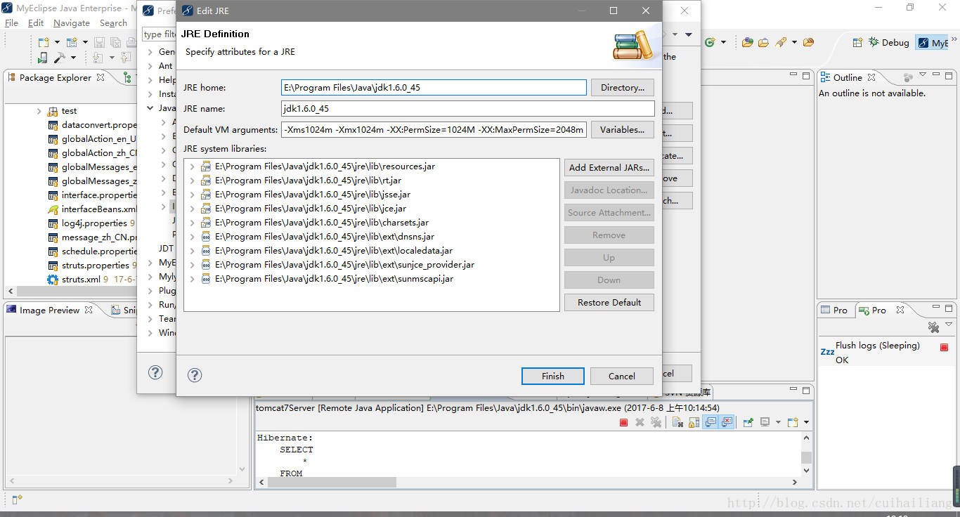 在MyEclipse上侧选项中:Window-Preferences-Java-Installed JREs-选择JDK-右侧Edit-在Default VM aguments:中输入 -Xms256m -Xmx512m -XX:PermSize=64M -XX:MaxPermSize=128m.