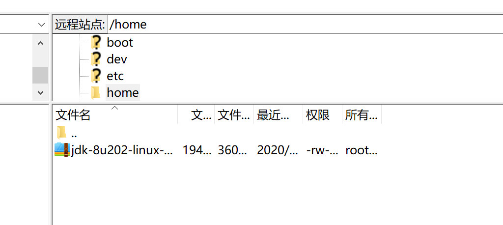 2.使用fileZilla或者其他ftp软件连接阿里云服务器并上传jdk文件(路径随意,本文上传的是/home目录下)。