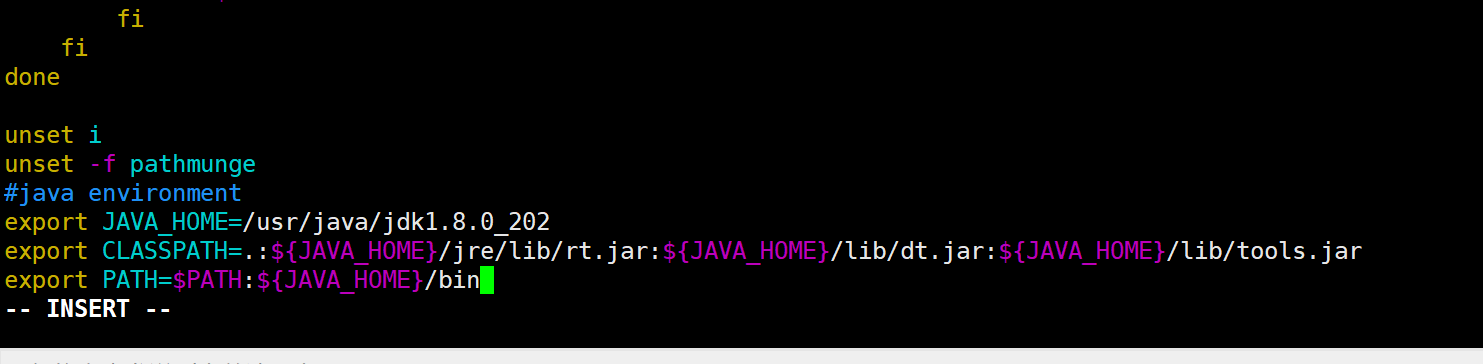 进入profile文件后键盘按住 i 进入编辑模式,添加如下代码