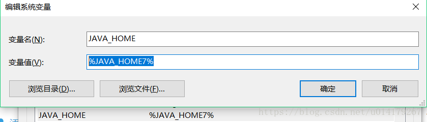 3、java7和java8都设置好了以后,再增加一项:JAVA_HOME=%JAVA_HOME7% (%号前的7就是你当前想要用的版本,改为8就可以用8了,很方便)
