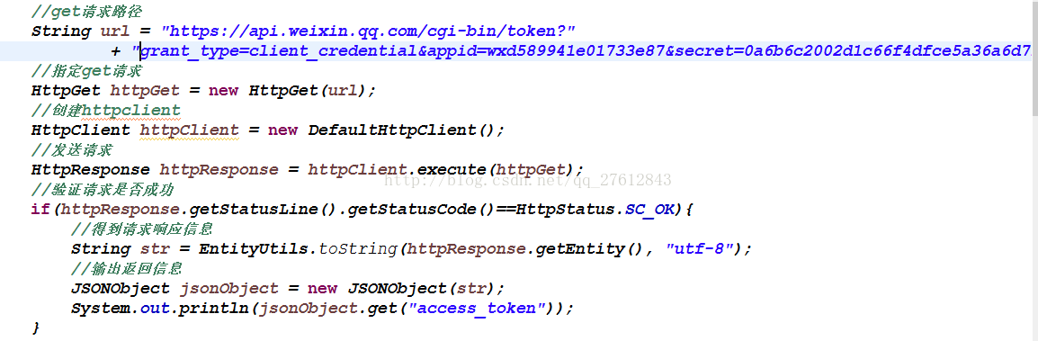 在获取access_token时使用的是get请求,那么也就是说我们需要在通过httpclient发送以个get请求