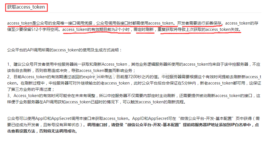 通过阅读微信开发者文档会发现——>access_token是公众号的全局唯一接口调用凭据,公众号调用各接口时都需使用access_token。开发者需要进行妥善保存。access_token的存储至少要保留512个字符空间。access_token的有效期目前为2个小时,需定时刷新,重复获取将导致上次获取的access_token失效。