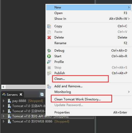 1.右键点击需要启动的tomcat,选择Clean和Clean Tomcat Work Directory,清除即可!