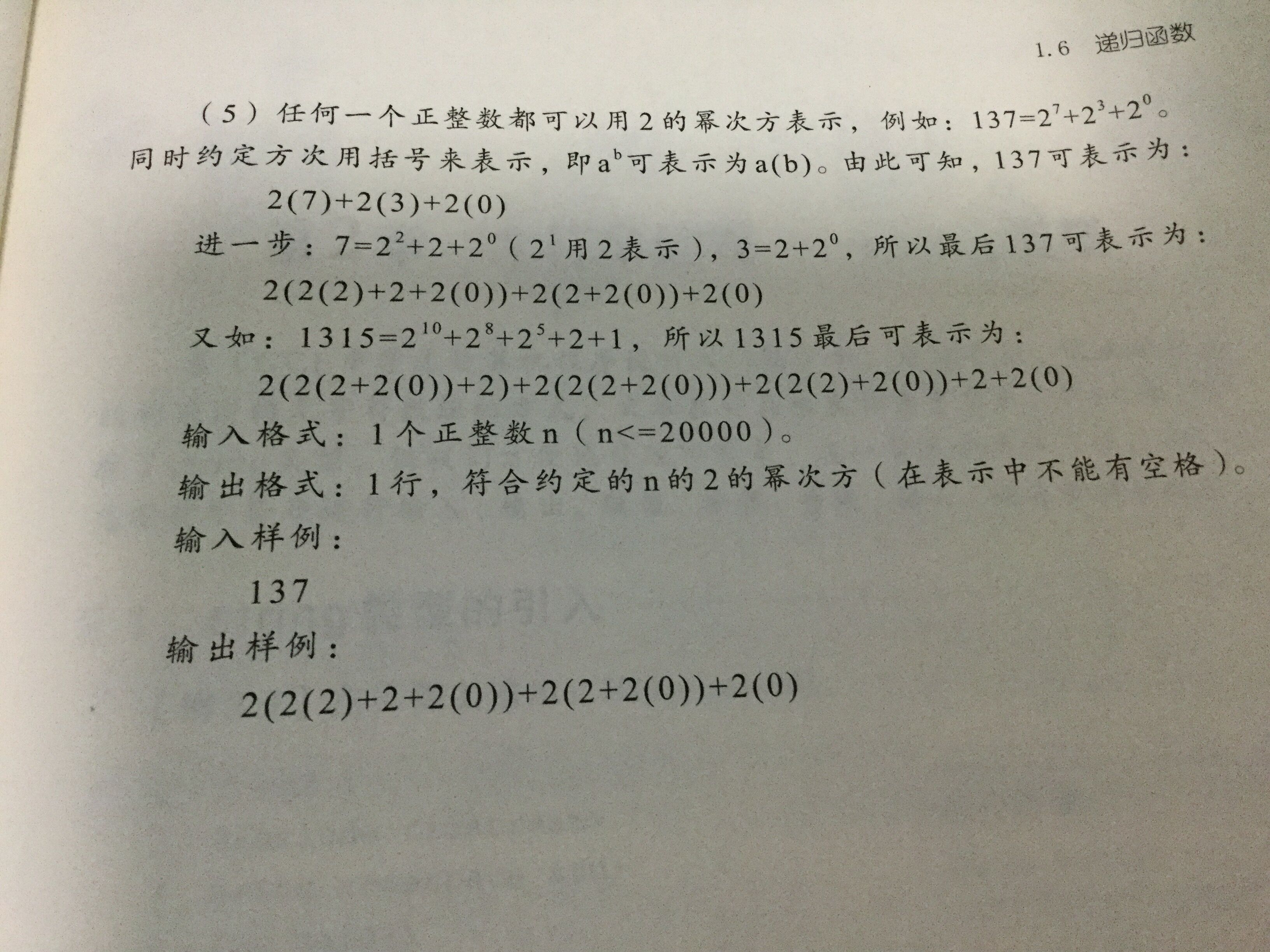 以上就是忐忑书包最近收集整理的关于用2的幂次方表示任意整数--递归的全部内容,更多相关用2内容请搜索靠谱客的其他文章。
