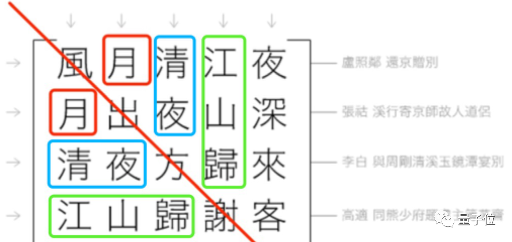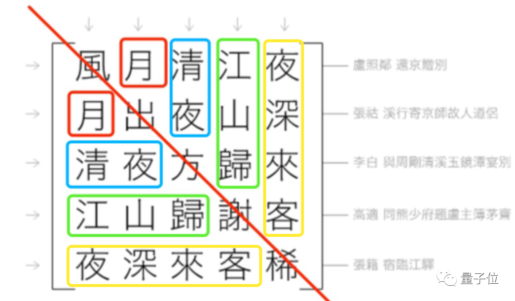 其一,以五言诗为例,第五列的前 4 个字,和第五行的前 4 个字,内容是否完全一样?如果不一样,就扔掉。