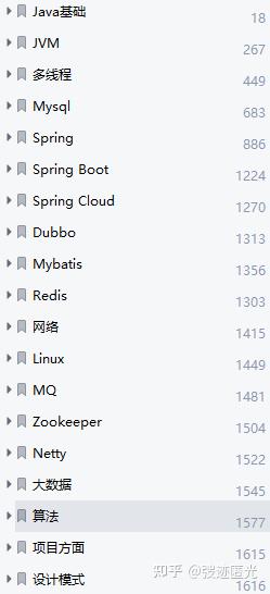 文档涵盖 Java 基础,设计模式,JVM,多线程,Mysql,Spring,Spring Boot,Spring Cloud,Dubbo,Mybatis,Redis,网络,Linux,MQ,Zookeeper,Netty 甚至大数据算法项目方面,足足有 1658 页,可以说是比较全的了。篇幅限制就只为大家展示目录跟部分内容了