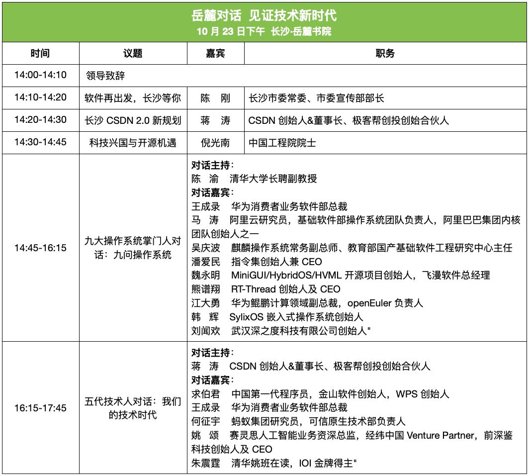 1024 程序员节会议日程历时3天,议程爆满,场场精彩,其中10月23日的岳麓对话备受关注。这一场高规格的对话将以“见证技术新时代”为主题,论道下一代操作系统发展方向,探讨中国原创基础软件的自力更生之路,共话技术新时代的新机遇。