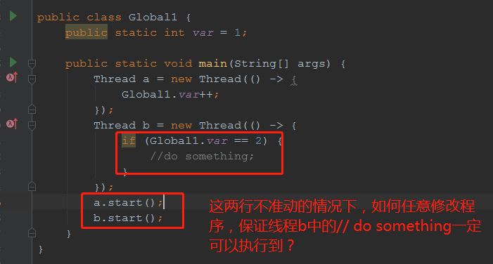 程序里定义了一个全局变量,var = 1;线程a会修改这个变量为2,线程b则在变量为2时,执行自己的业务逻辑。