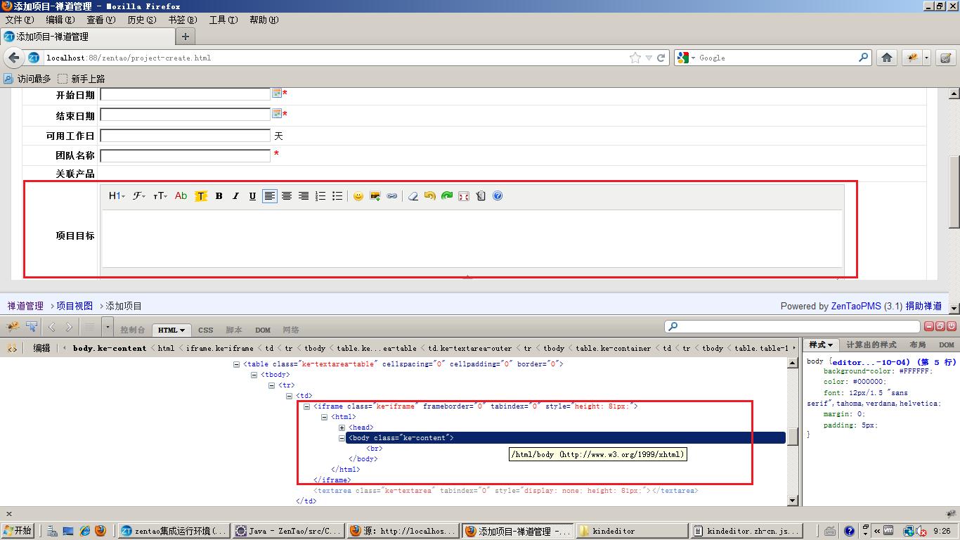 这个项目目标就是一个富文本,下面是firebug识别出来的信息,通过classname你会发现是找不到元素的,而且使用IDE录制也是无法录制这个输入的。我们来看下网页的源代码,看看里面是怎么定义的。