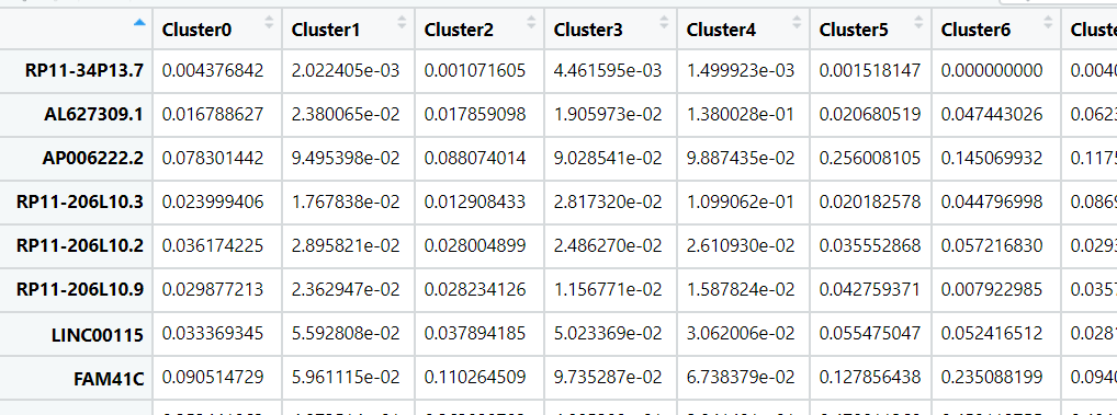 Idents(scRNA_data) <- "seurat_clusters" # 这一步可以指定要计算哪一个分组的平均表达量,可以选择细胞类型("CellType")cluster("seurat_clusters")或者是样本类型("orig.ident"),要注意这里的变量名称不一定正确,要根据数据中的具体变量来指定