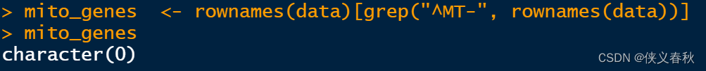 注:这个代码是用来检测线粒体基因的开头是啥的,又是后要注意,有些情况下,作者的线粒体基因以MT开头,在后面同样不能筛选线粒体基因,为啥呢?因为还有很多无辜的基因会被你一同算进去。这里的testdf是一开始输入的原始数据。如果基因名字不是行名而是第一列,请更改代码:rownames(testdf) 为 testdf[,1]