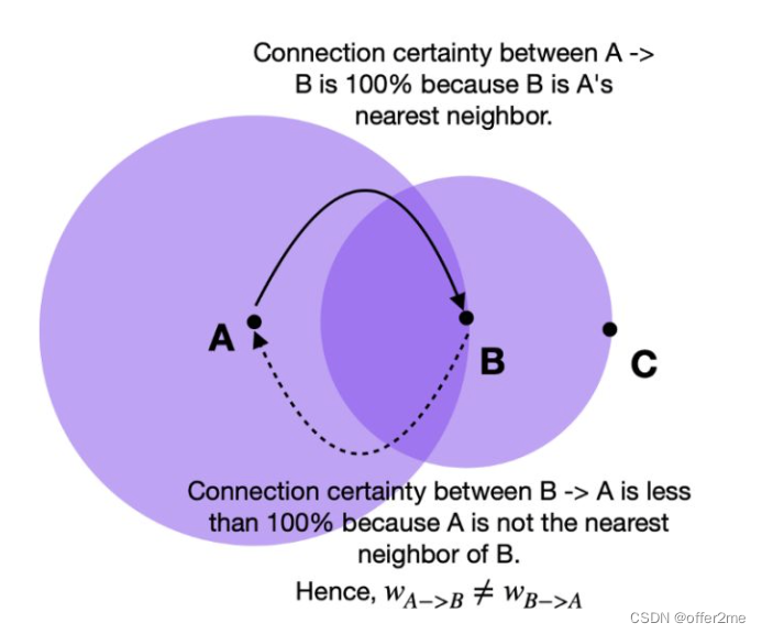 连接确定性是通过边权重(w)来表达的。由于我们采用了不同距离的方法,因此从每个点的角度来看,我们不可避免地会遇到边缘权重不对齐的情况。 例如,点 A→B 的边权重与 B→A 的边权重不同。