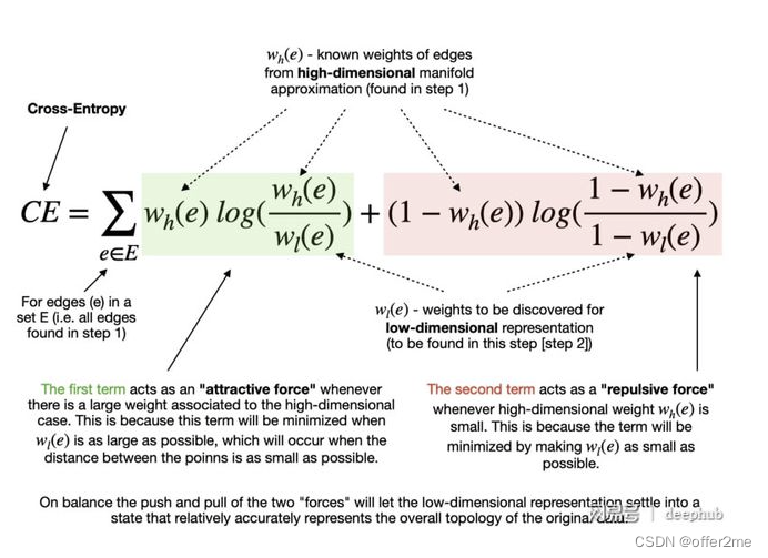 指定最小距离后,该算法可以开始寻找较好的低维流形表示。 UMAP 通过最小化以下成本函数(也称为交叉熵 (CE))来实现: