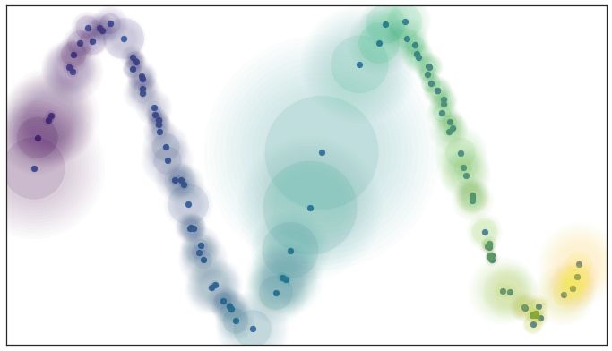 你一定已经注意到上面的图也包含了模糊的圆圈延伸到最近的邻居之外。这告诉我们,当我们离感兴趣的点越远,与其他点联系的确定性就越小。