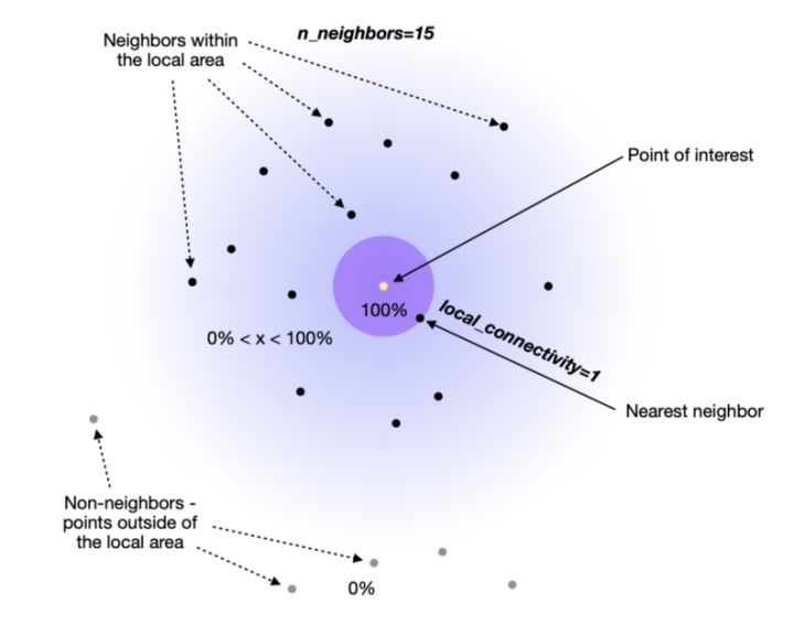 n_neighbors(默认值为15):一个点直接连接到第 16 个以上的邻居的可能性为 0%,因为它在构建图时落在 UMAP 使用的局部区域之外。