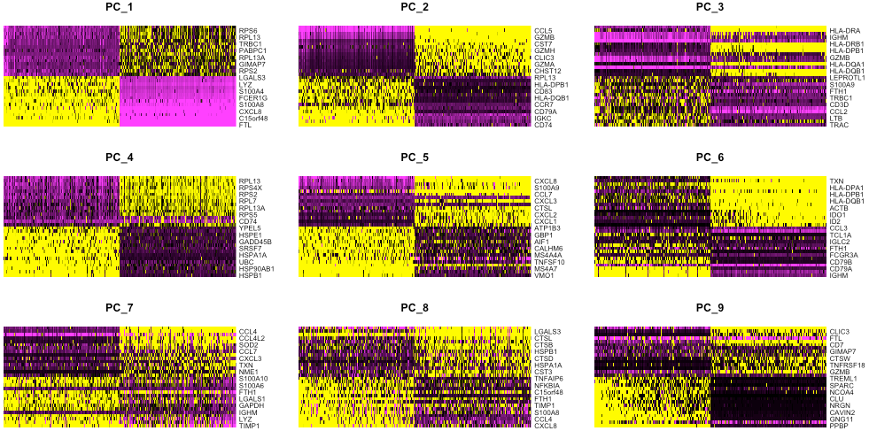 一种方法是Seurat自带的热图可视化,利用heatmap(获取pheatmap聚类后和标准化后的结果)以PCA分数排序的基因和细胞可视化选定PC的最变异基因。观察不同PC的重要性,查看基因差异是否明显,确定驱动PC的基因对于区分不同细胞类型是否有意义。
