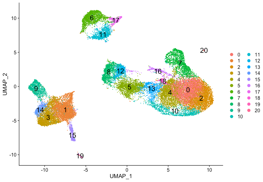 为了可视化不同的细胞亚群,最受欢迎的两种方法分别为t-distributed stochastic neighbor embedding (t-SNE)(https://kb.10xgenomics.com/hc/en-us/articles/217265066-What-is-t-Distributed-Stochastic-Neighbor-Embedding-t-SNE-) 和 Uniform Manifold Approximation and Projection (UMAP)(https://umap-learn.readthedocs.io/en/latest/index.html) 。两种方法的目的都是通过计算使得在高维空间中具有相似局部邻域的细胞在低维空间中也聚类到一起(Hemberg-lab单细胞转录组数据分析(十二)- Scater单细胞表达谱tSNE可视化)。这些方法都是基于PCA的结果,需要求输入用于分析的PC数,建议使用与上面FindClusters分析时相同的PC数。