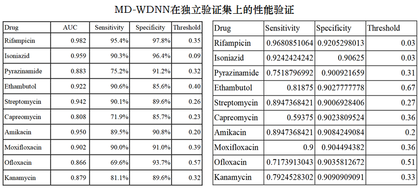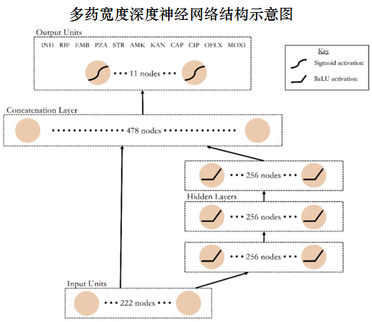 最后一层的11个节点代表每一种药物,其输出值为MTB分离株对相应药物产生耐药性的概率。
