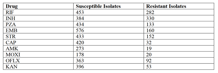 XDR: 对一种二线注射药物耐药,如阿米卡星[AMK]、卡那霉素[KAN]或卡波霉[CAP],以及一种氟喹诺酮耐药,如莫西沙星[MOXI]、氧氟沙星[OFLX]