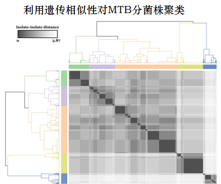 使用33个遗传谱系标记的序列数据,计算分离株之间的欧式距离。 构造系统树图并将这些分离株分为五个集群,与MTB已知的遗传谱系相对应。