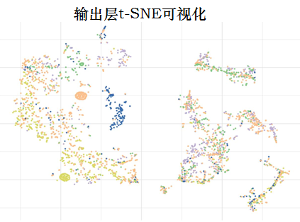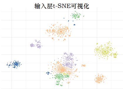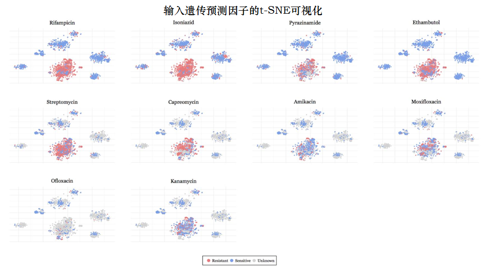 输入的遗传标记最初在222维空间中,投射到二维空间中。每个点是一个MTB分离株。输入遗传标记上的t-SNE表现出明确的簇状结构,簇间的抗性分类模式难以识别。