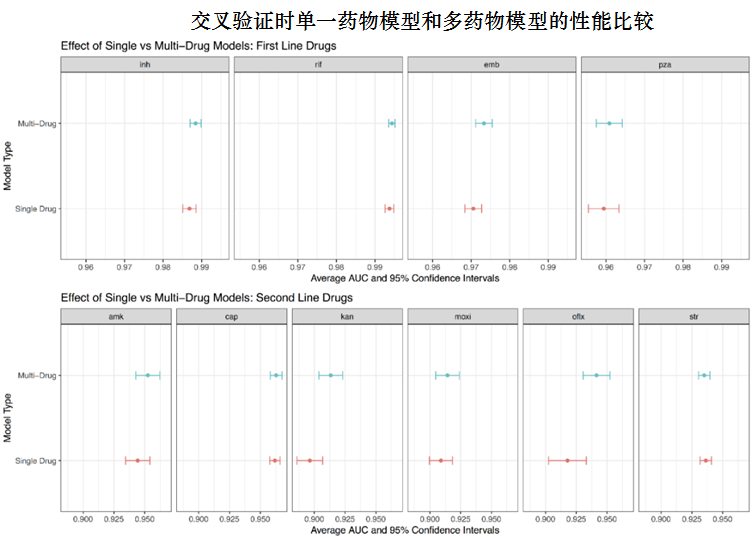 包含一种第二行注射药物并且包含至少两个预测因子的药物子集一致包含INH和RIF。这与先前知识一致,即在一线药物有耐药性后,才会使用二线药物。多药模型能够捕捉到这些关系。