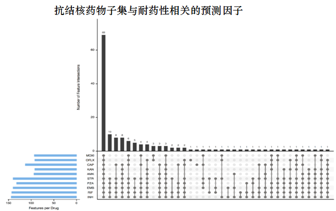 下图显示了每种药物的重要预测因子的数量和每个药物子集的突变数量。有37个药物子集共享至少一个耐药预测因子。最大的一个子集是10种抗结核药物,共有69种耐药性预测因子。