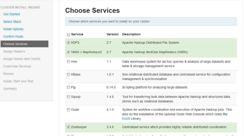 5. 选择要安装的软件名称。本文环境选择了 HDFS,YARN + MapReduce2,Zoopkeeper,Storm 以及 Spark。选的越多,就会需要越多的机器内存。选择之后就可以继续下一步了
